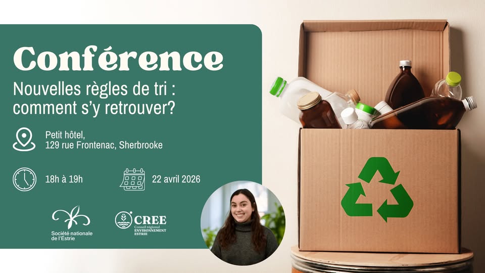 À l’occasion du Jour de la Terre, cette conférence du CREE, organisée par la Société nationale de l’Estrie, démystifie la nouvelle consigne et outille les participants à bien gérer leurs matières, à la maison comme au travail. En deuxième partie, un atelier participatif amène le groupe à explorer le cycle de vie d’objets à usage unique, notamment les gobelets de plastique, pour comprendre leurs impacts environnementaux, de la production à la fin de vie. Une activité concrète qui permet de relier le tri à des choix de consommation plus éclairés.